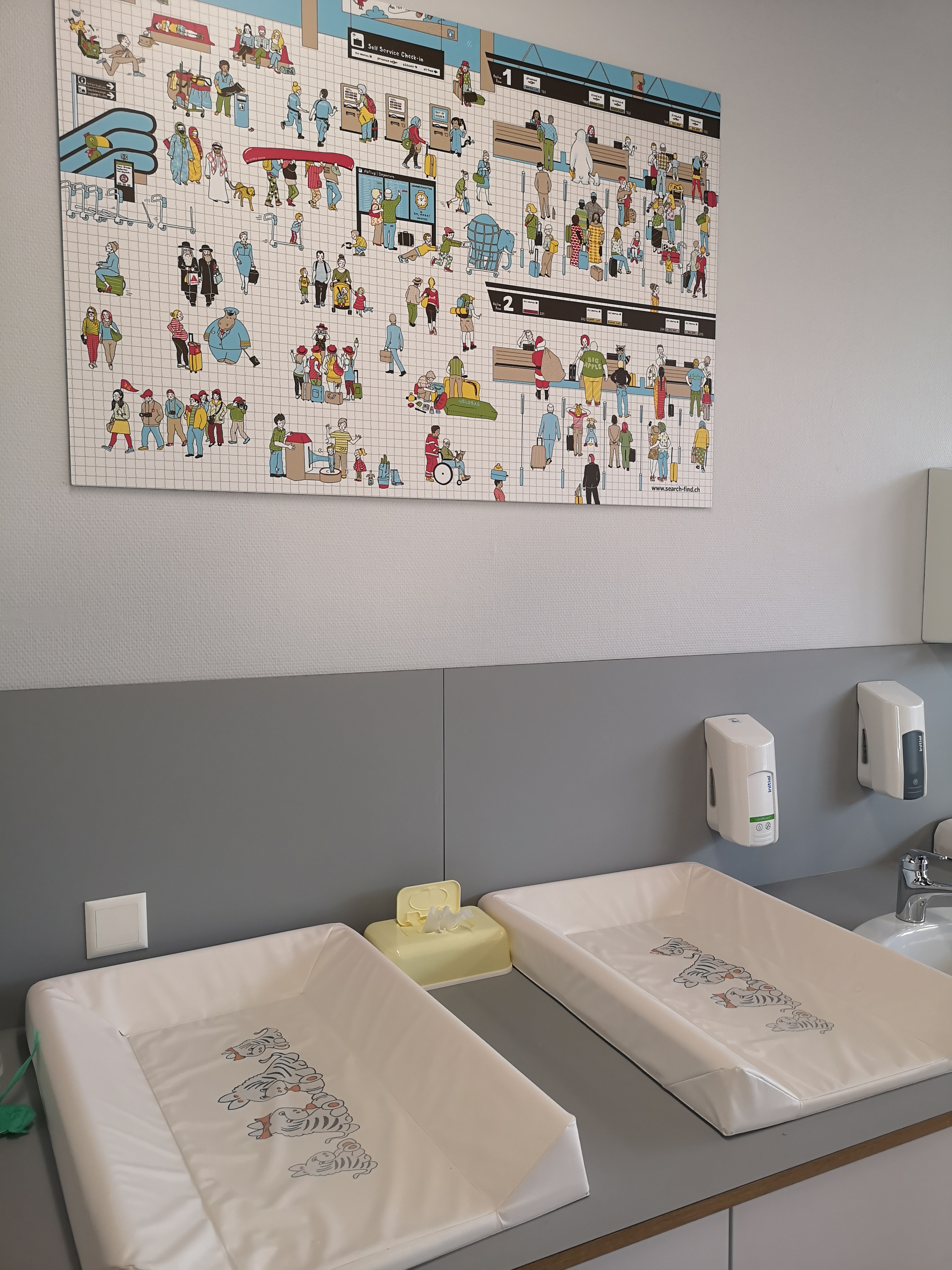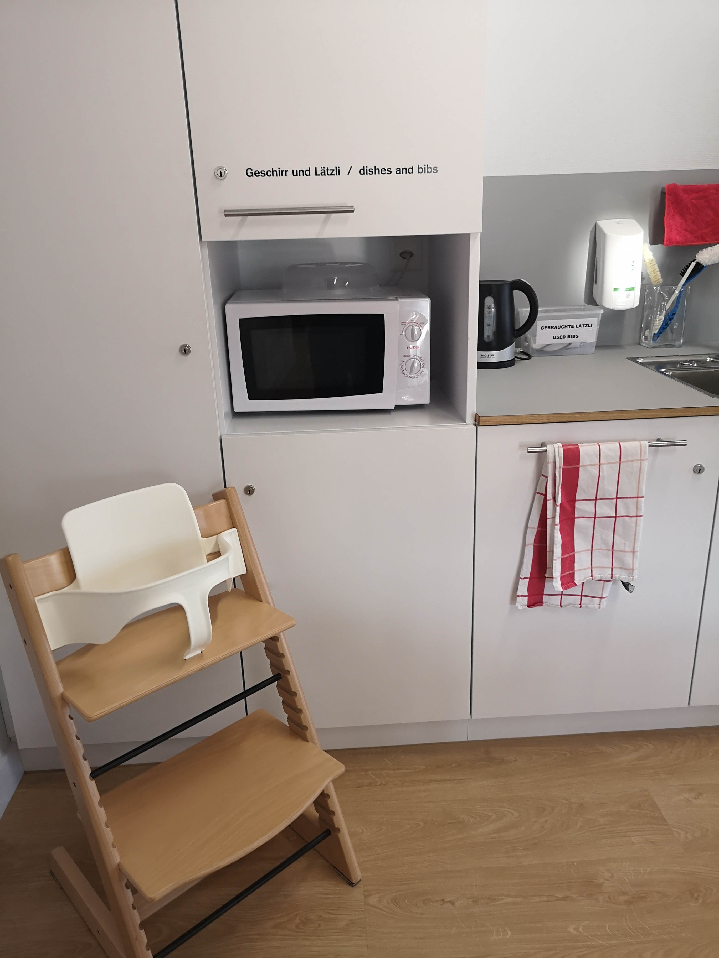 Čeprav sta moja otroka že velika, je bila prva stvar, ki sem jo opazila, kako so prilagojeni družinam z dojenčki oziroma malčkom. Na voljo so jim previjalne mize z razkužilom in vlažnimi robčki, zraven pa so tudi umivalniki. Na voljo jim je kuhinja z grelcem vode, pomivalnim koritom in mikrovalovno pečico, poleg pa je tudi omarica, ki je založena s plastičnimi krožniki, kozarčki in priborom. Celo slinček iz blaga dobite kar tam in ga po uporabi le odvržete v koš za umazano perilo.