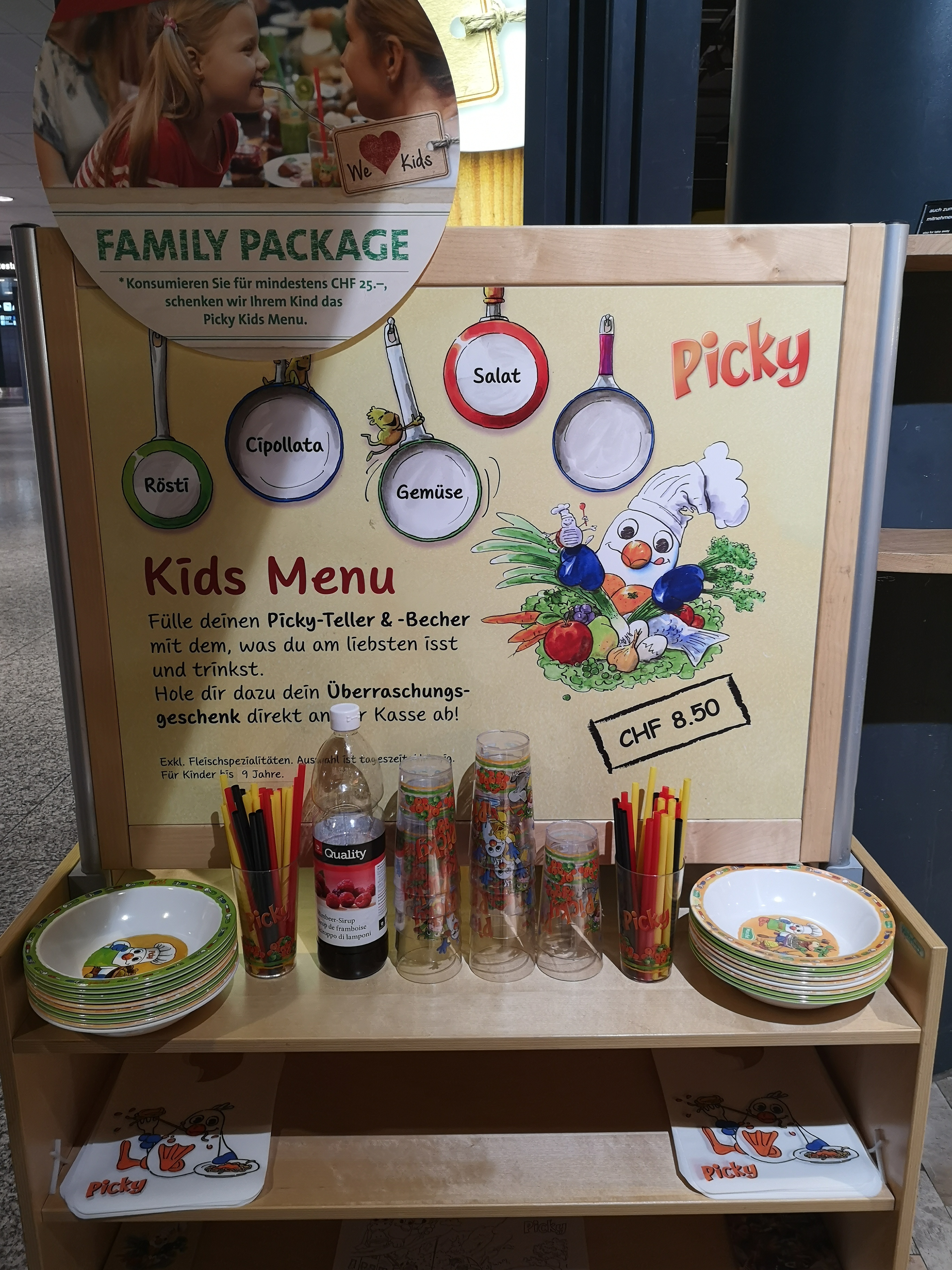 Omeniti velja, da ta igralnica ni edina na letališču (je pa največja), na otroke pa mislijo tudi v restavracijah. Ko smo šli nekaj pojest, smo v Marcheju opazili posebno polico, kjer so bili otroški krožniki, kozarci, slamice in prtički in celo malinovec za razredčit. Letališču Zurich za odlično skrb za družine tako lahko le čestitam, malo manj pohval pa zaslužijo njihove cene, ki so v restavracijah in kavarnah res precej visoke.