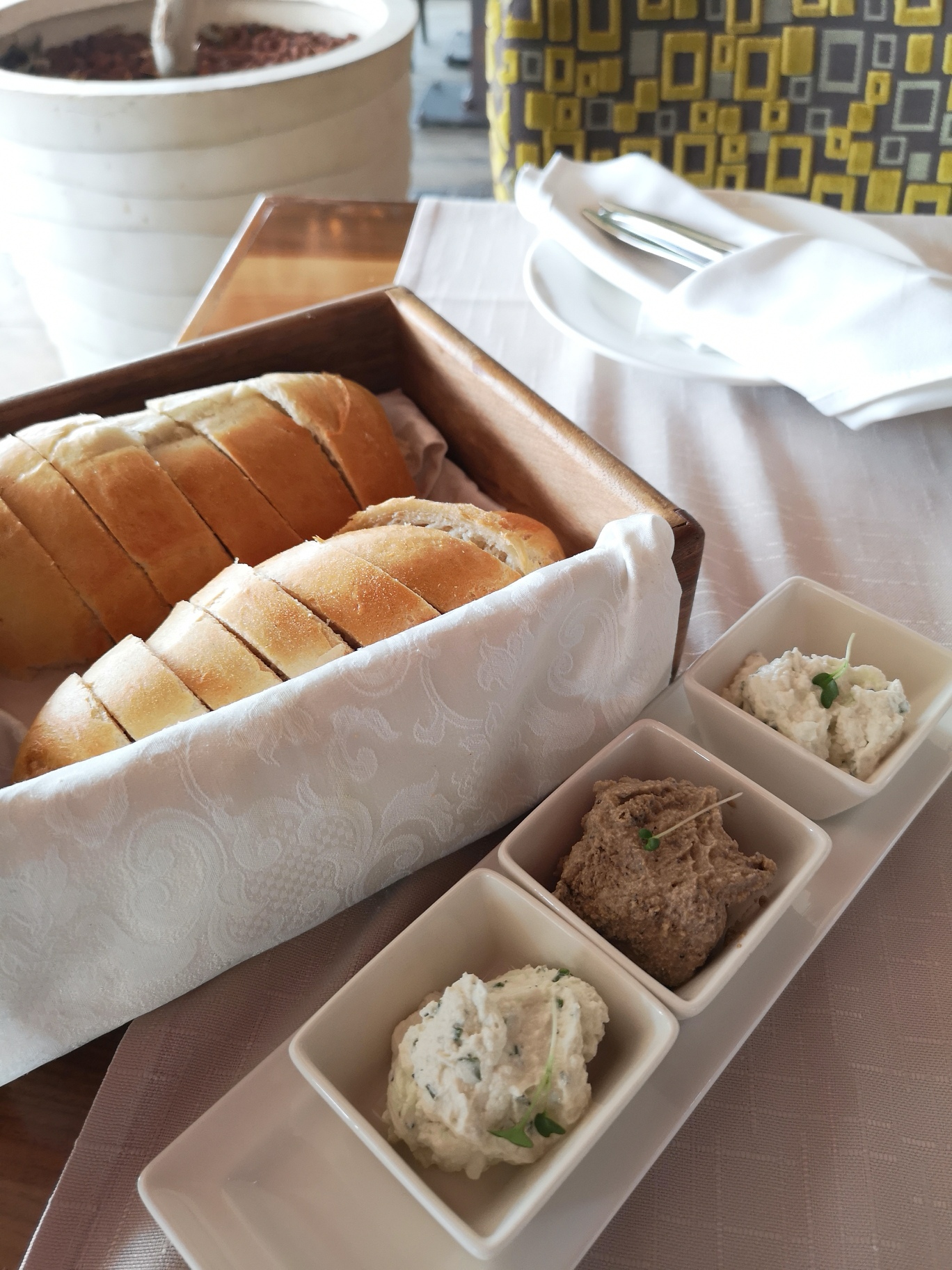Kaj smo naročili? Najprej so nam prinesli pozdravček iz kuhinje, in sicer topel hrustljav kruh z namazi iz oliv in skute. Zelo dobro je bilo in Maj je že pri prvem ugrizu v kruh s skutnim namazom vprašal: “Mami, a bomo sem še kdaj prišli? Ful je dobro!”