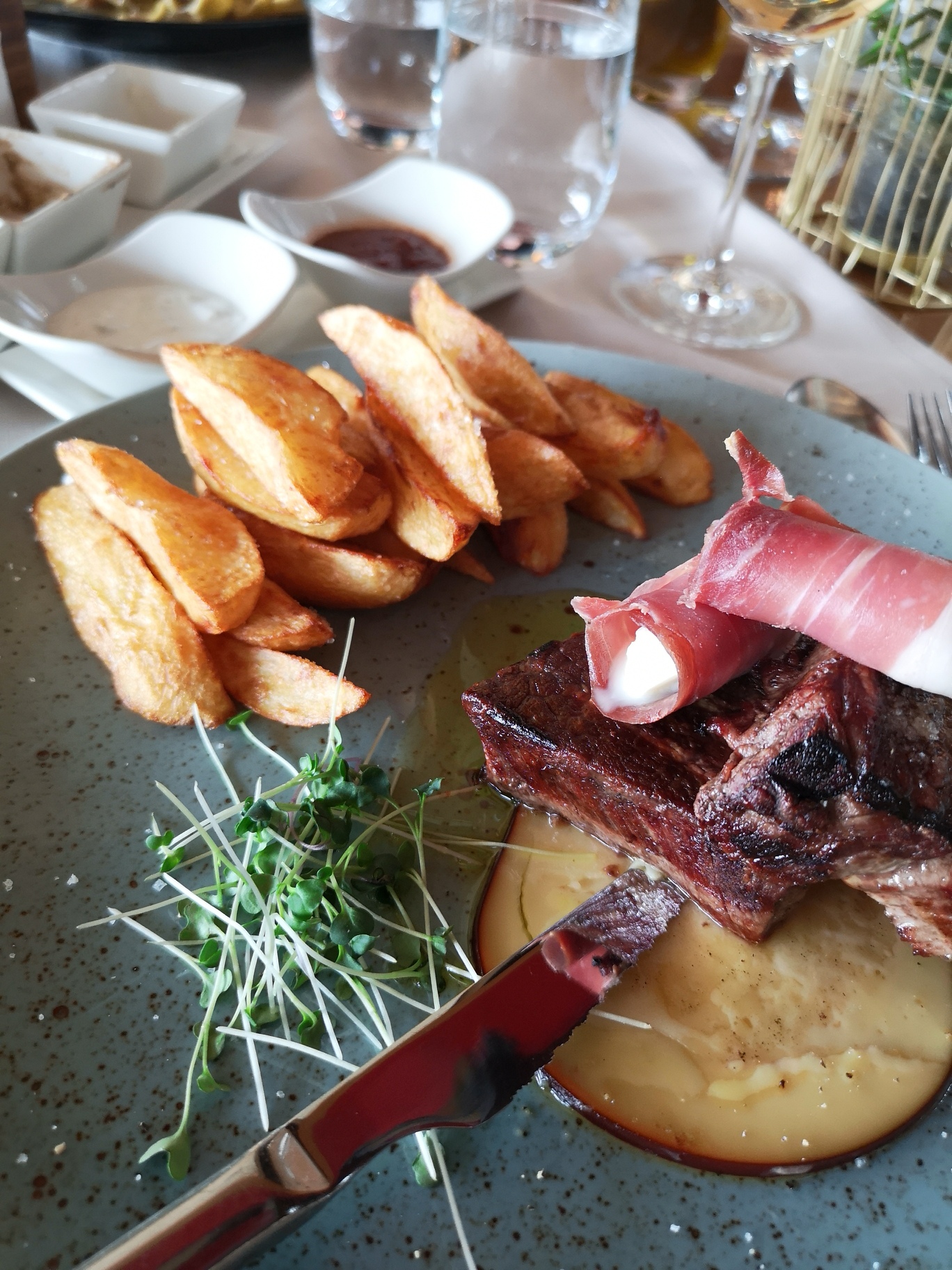Sama sem naročila goveji file na lava grillu s pečenim krompirčkom ter dodatkom pršuta in mocarele. Meso je bilo izvrstno in mehko, krompirček pa odličen.