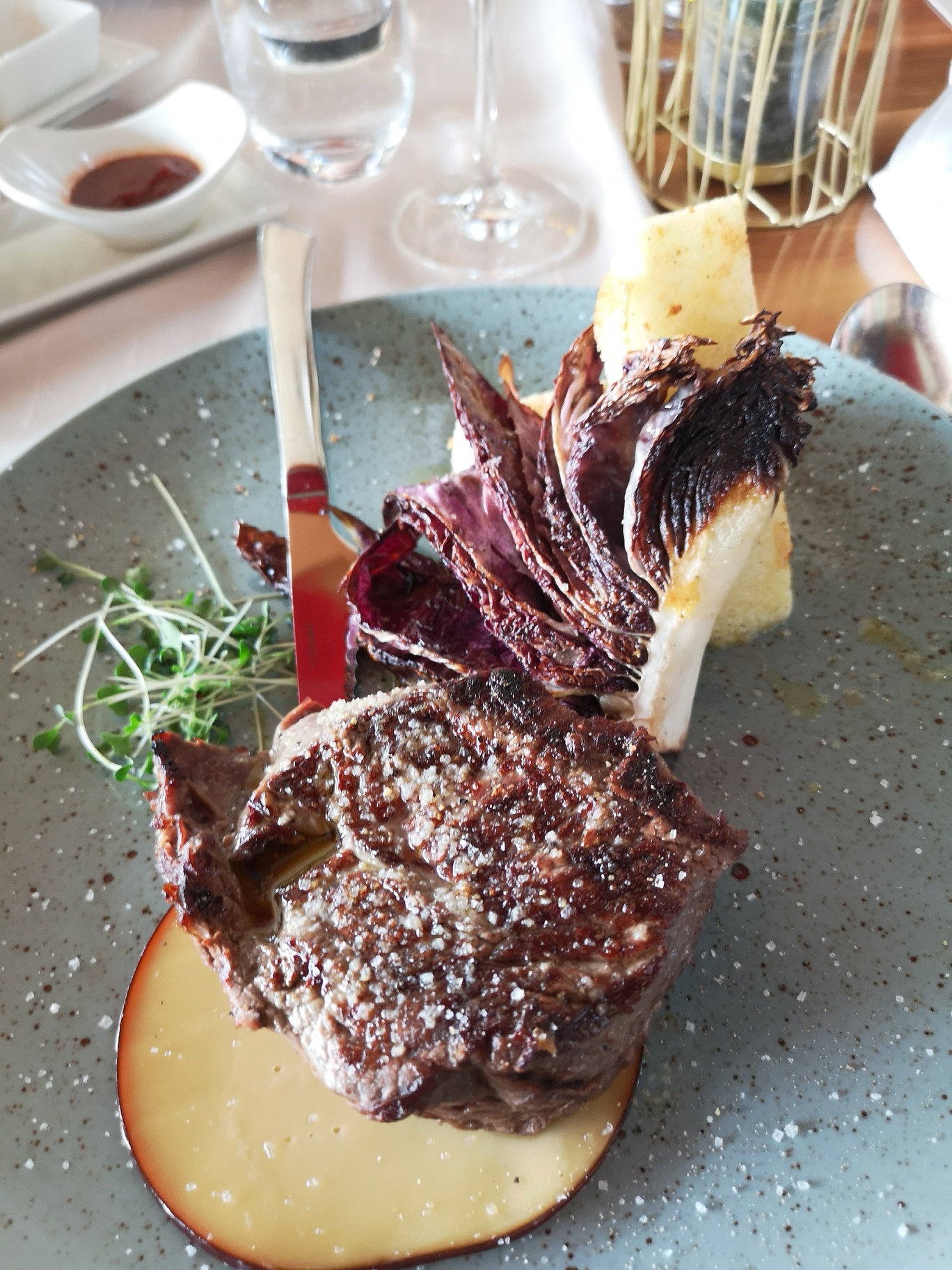 Kaj nam je bilo všeč? Tokrat je bil nad naročenim najbolj navdušen Tadej, ki je naročil beefsteak na lava grillu z belo polento in popečenim treviškim radičem. Z govedino Tadej ni pogosto zadovoljen, saj mu jo ponavadi prepečejo (kljub temu, da naroči rare), tokrat pa je rekel, da je bilo meso popolno pečeno in mehko kot “putrček”. Da ne omenjam, kako dobro je zraven prijalo vino – naročila sva Krasno belo iz kleti Brda.
