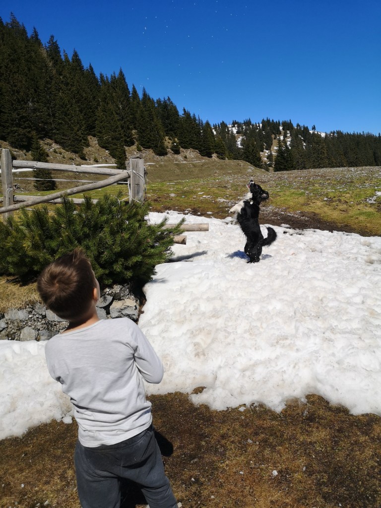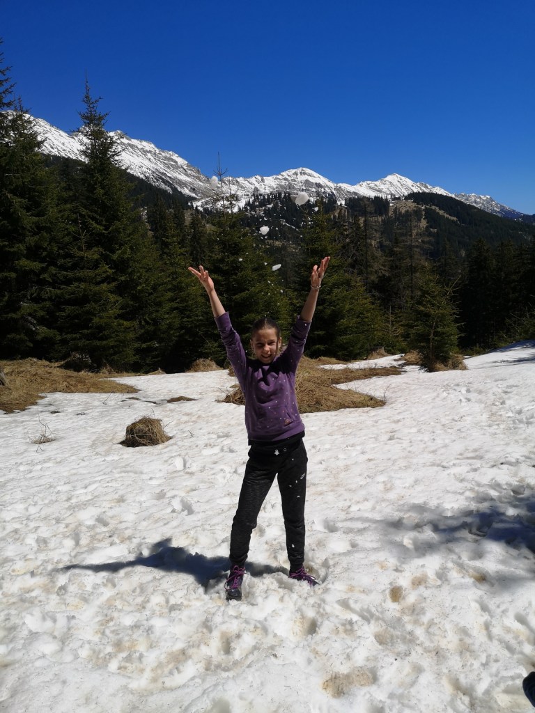 Naslednji dan nas je pot vodila v hribe. Skozi čudovito Dovžanovo sotesko smo se zadnjič sprehajali, tokrat pa peljali, saj smo pot nadaljevali proti vasi Jelendol, od tam pa smo zavili na makadamsko pot. Po nekaj minutah vožnje smo parkirali avto in pot nadaljevali peš. Najprej nas je čakal krajši, a nekoliko bolj strm del poti, na vrhu katerega nas je pričakalo nekaj snega, kar je otroke seveda strašno razveselilo. Sneg sredi maja, kaj bi lepšega? 🙂