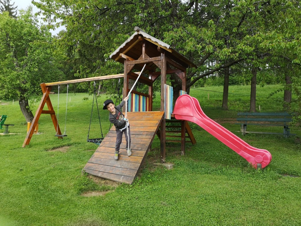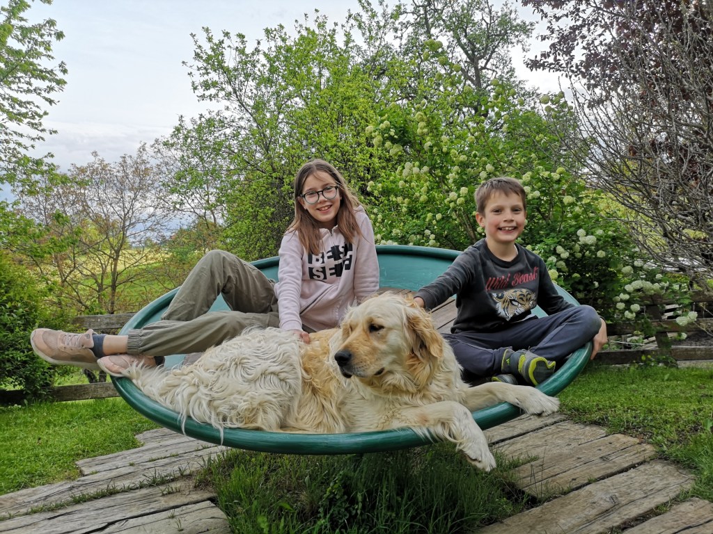 Kljub lepo opremljenim sobam, tam ne boste prav veliko, saj smo mi morali takoj ven, na vrt in na igrala. Že kmalu po prihodu smo se zaljubili v izjemno prijazno psičko Luno, ki bi jo naša tamalčka najraje odpeljala kar domov.