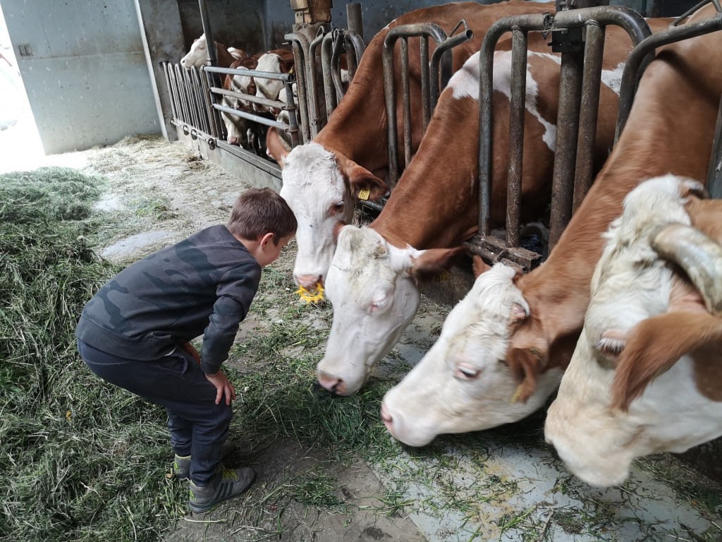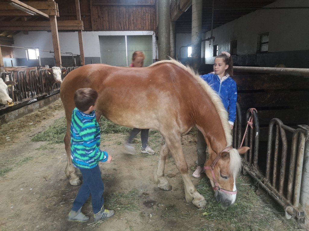 Po dobrem zajtrku in kavici, je sledil čas za spoznavanje živali na kmetiji. Enajstletna Julija je Juno in Maja peljala do pujskov in krav, ki so jih tudi nahranili, skrtačili so kobilo Malajko in ponija Marsija in se odpravili tudi na ježo. Časa ni zmanjkalo niti za crkljanje kokoši in zajčkov in otroci so se tako zaigrali, da sva imela midva čas zase, žal pa nam je nekoliko ponagajalo vreme, zato se nismo mogli podati še na kakšen mini izlet v okolici kmetije. Ne dvomim, da bi bil obisk Črnega jezera ali Bistriškega vintgarja tudi zelo zanimiv.