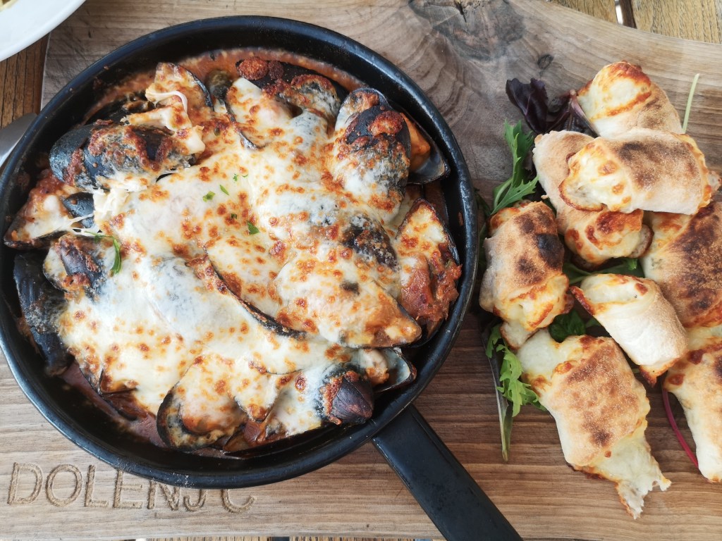 Kaj smo naročili? Tokrat sem bila sama z otrokoma, tako da smo mesno razvajanje izpustili (meso po navadi naroči Tadej), ampak smo se raje odločili za bolj morsko različico. Čeprav so me zelo mikali burgerji, ki so tam baje odlični, sem naročila gratinirane dagnje s sirovimi kruhki, Maj pa rezance z gamberi – oboje je bilo odlično.